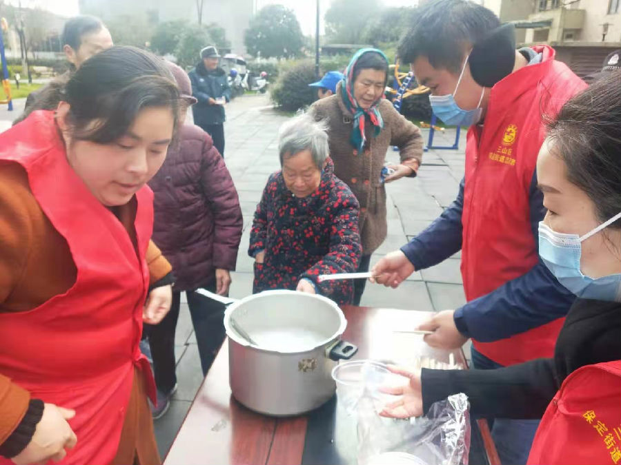 另一邊,公司黨員和村委會工作人員開始準備湯圓,在猜燈謎游戲環(huán)節(jié)結束后,大家為小區(qū)居民送上了熱氣騰騰的湯圓,節(jié)日氛圍逐漸散溢開來。寒冷的天氣里,居民們共同品嘗湯圓的甜蜜,感受物業(yè)的暖心。